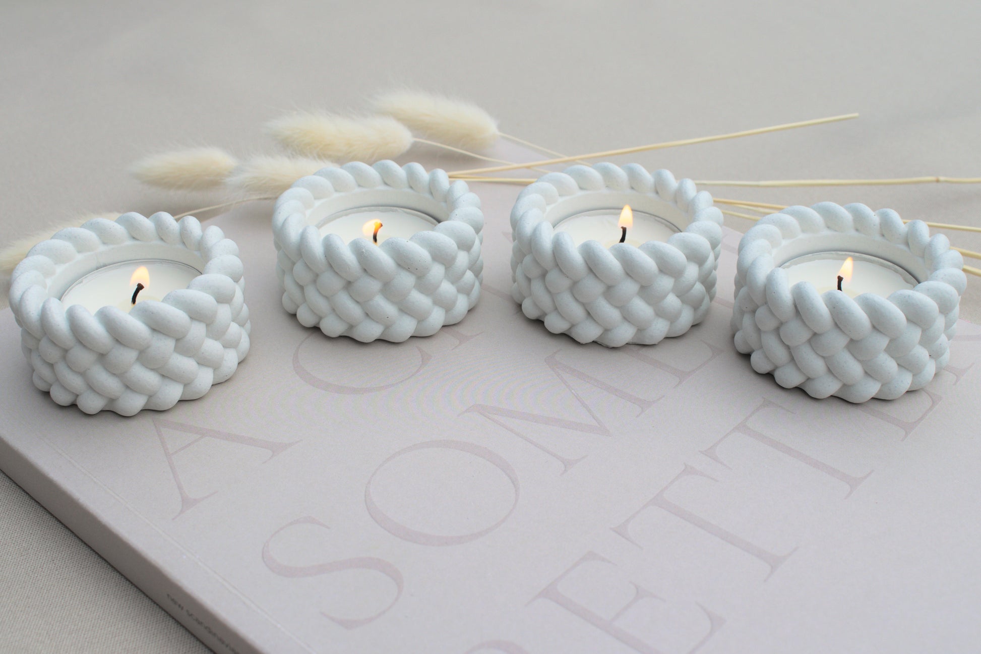 Skandi Teelichthalter/Kerzenhalter im Strickdesign aus weißem Beton.