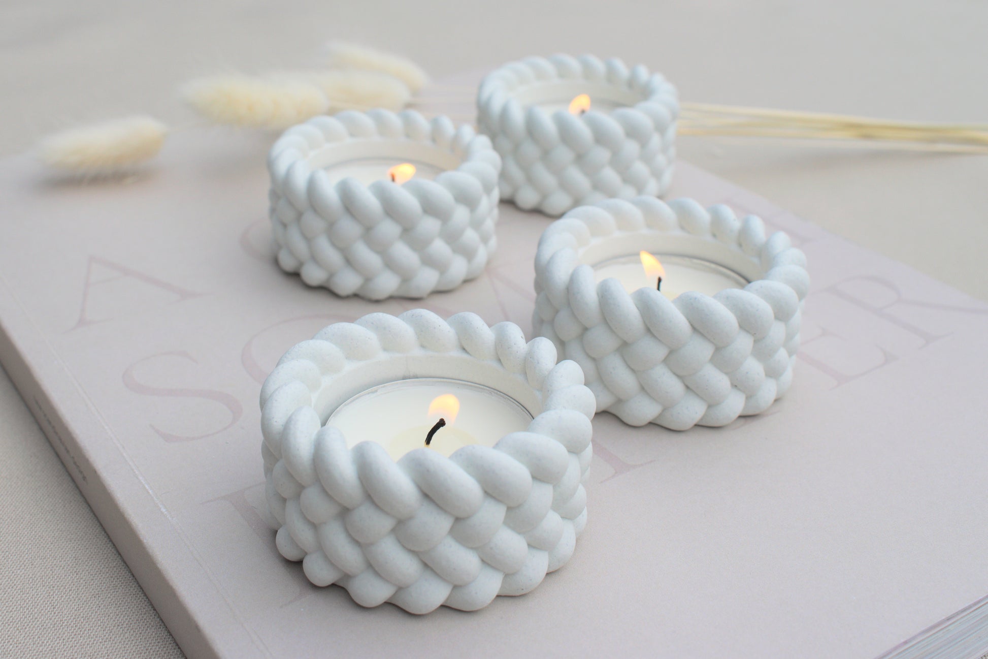 Bringe gemütliche Atmosphäre und modernes Design in dein zu Hause mit diesem handgefertigten Teelichthalter aus hochwertigem, weißem Beton. Die außergewöhnliche Strick- und Flechtoptik verleiht dem robusten Material eine weiche, textile Anmutung und macht jedes Stück zu einem echten Blickfang.