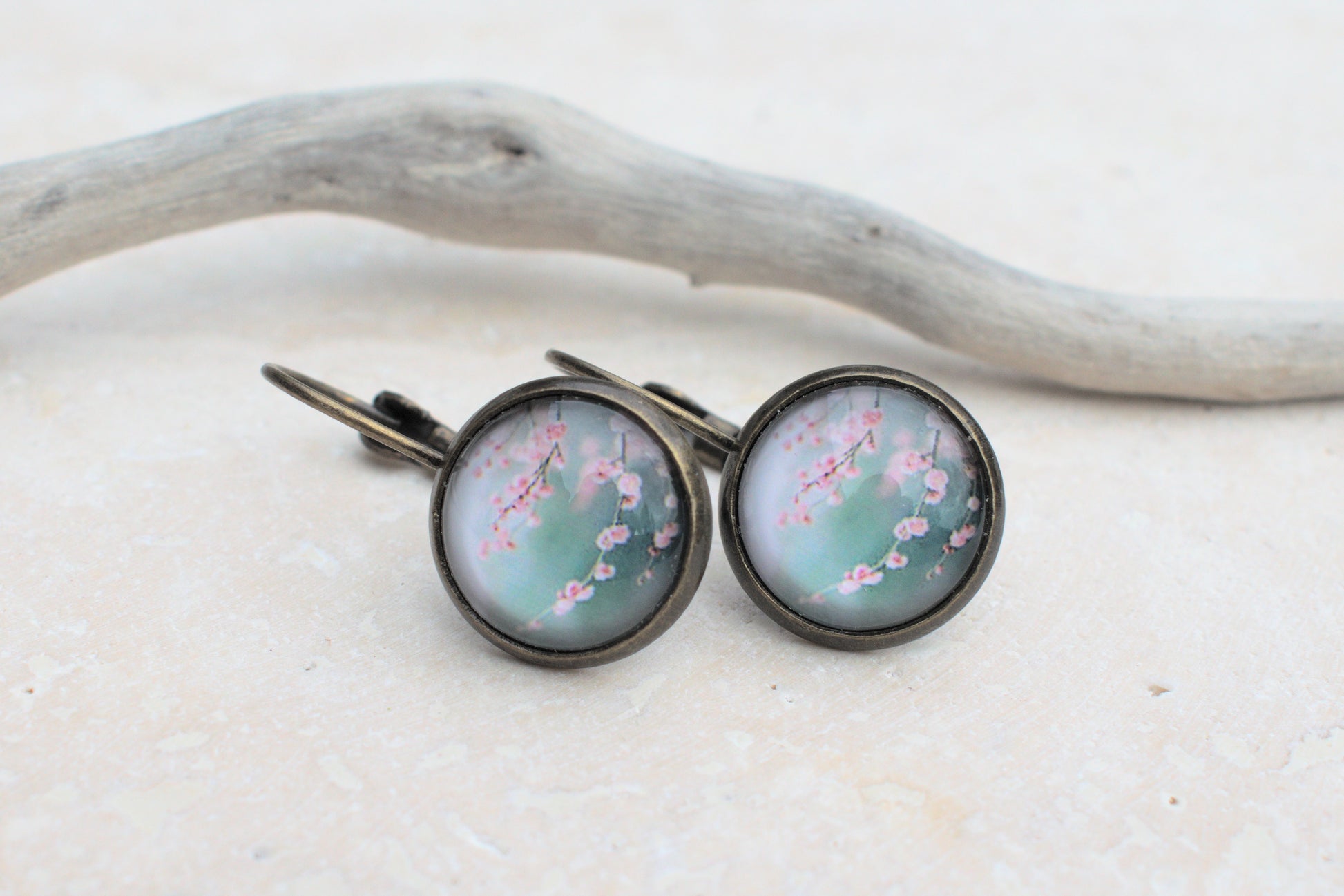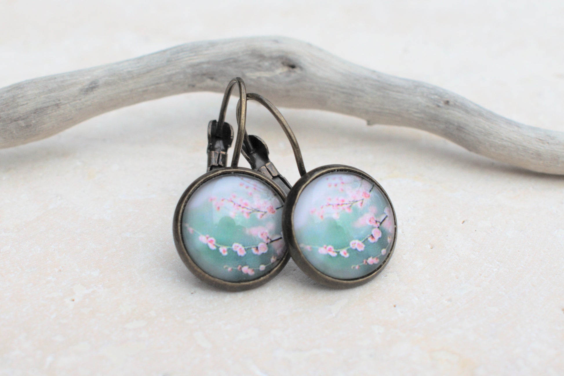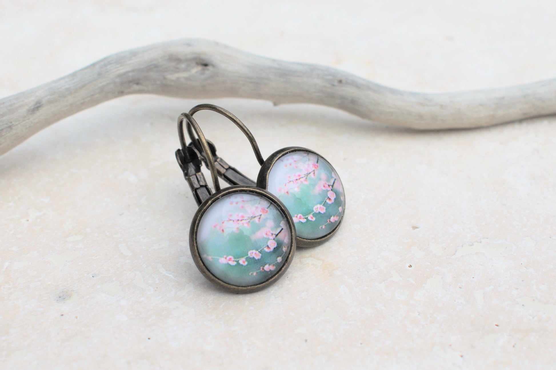 Bronzene Ohrringe mit Cabochon und Bild in blau und türkis mit rosa Kirschblüten