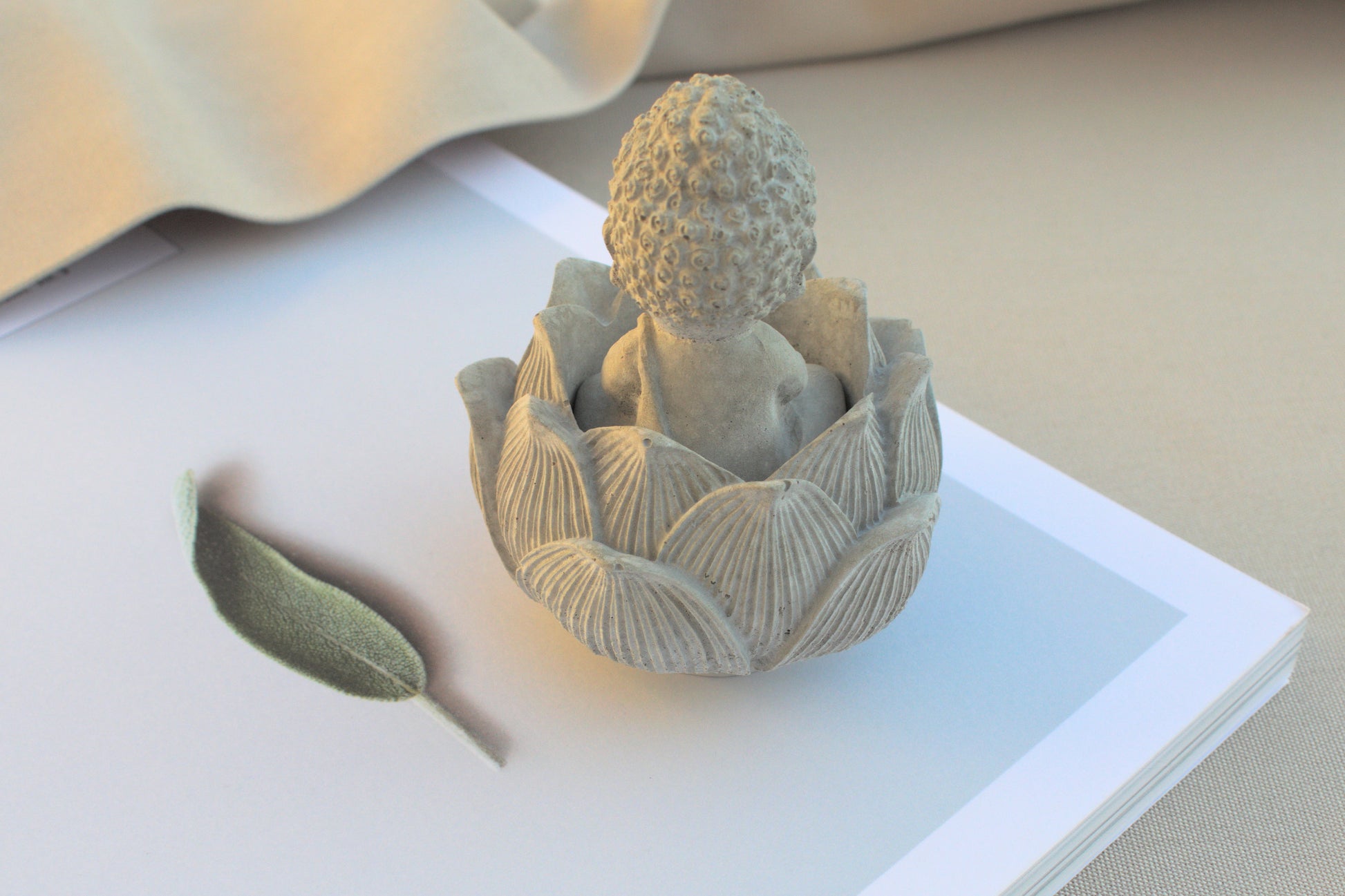 Kleiner Budda mit Lotusblüte aus grauem Beton für Ruhe beim Yoga