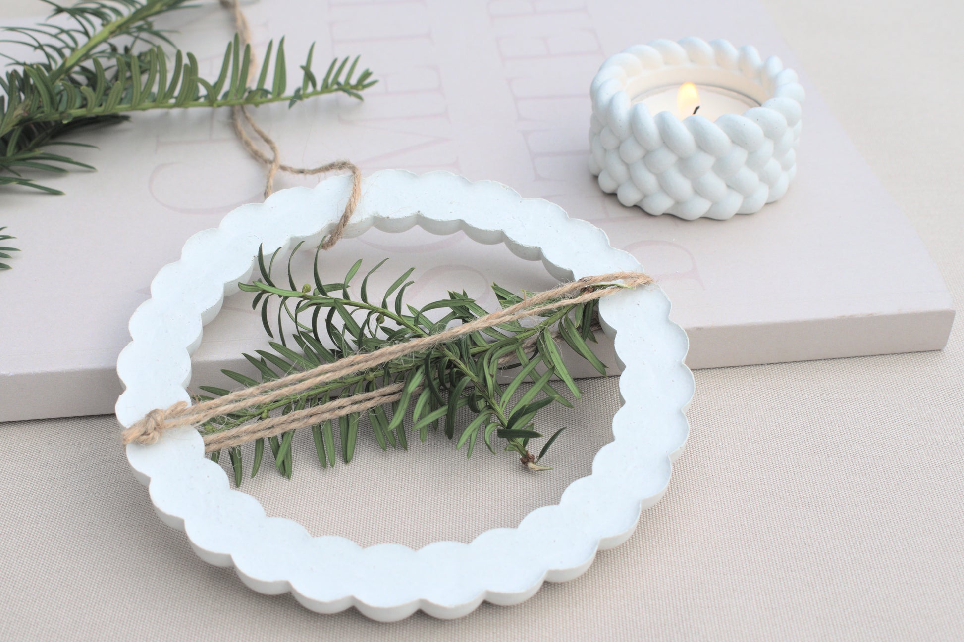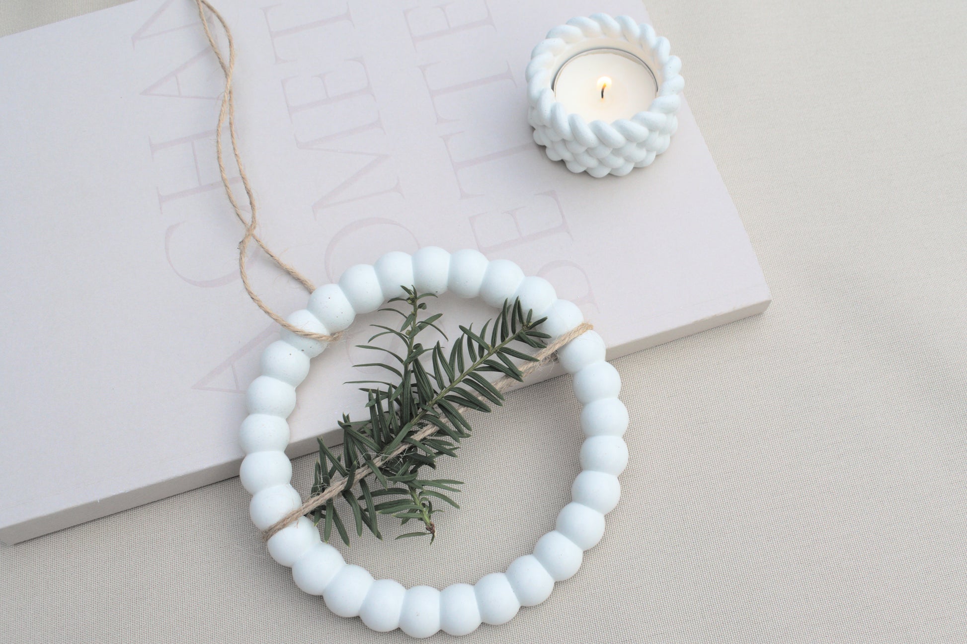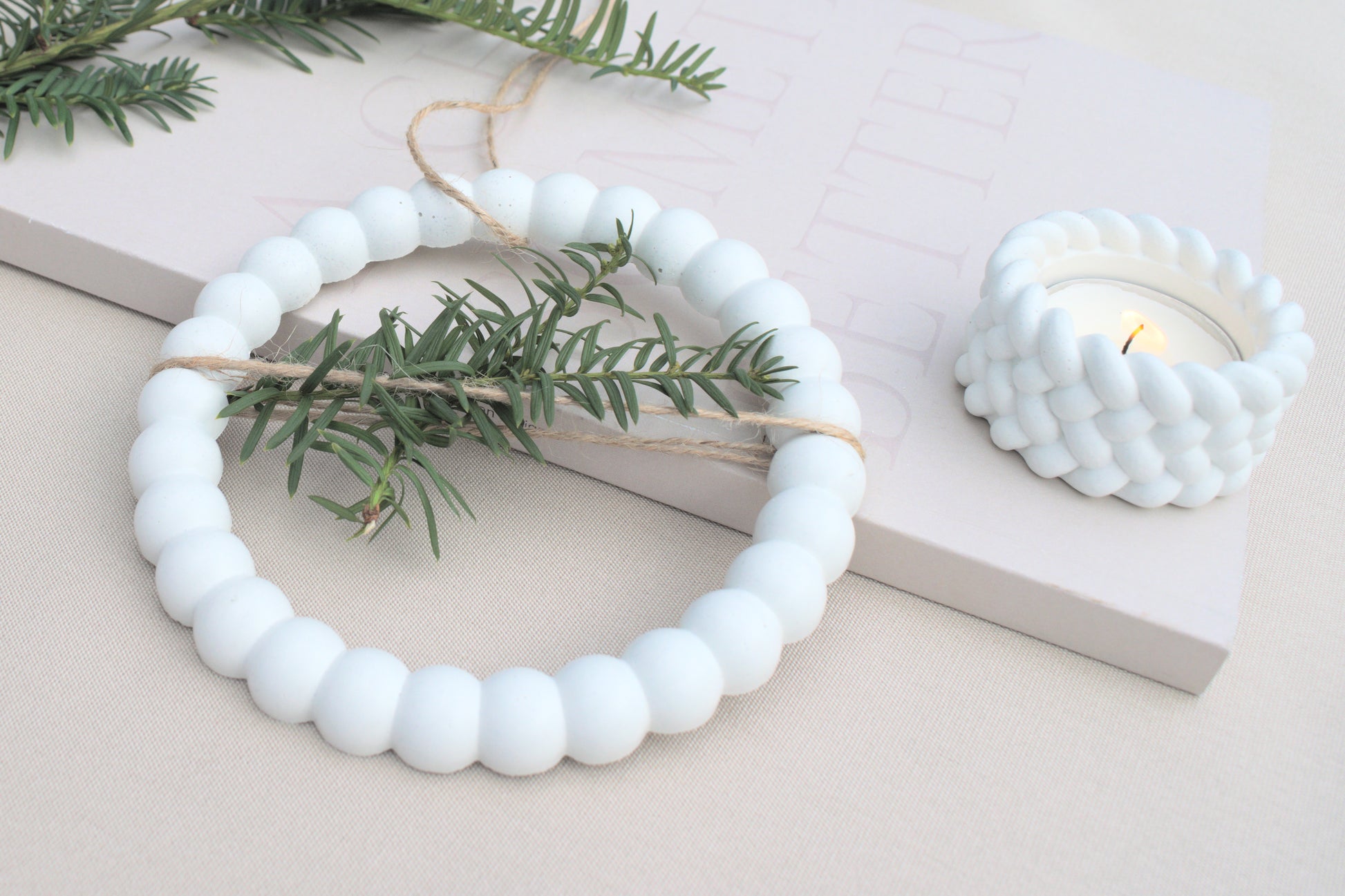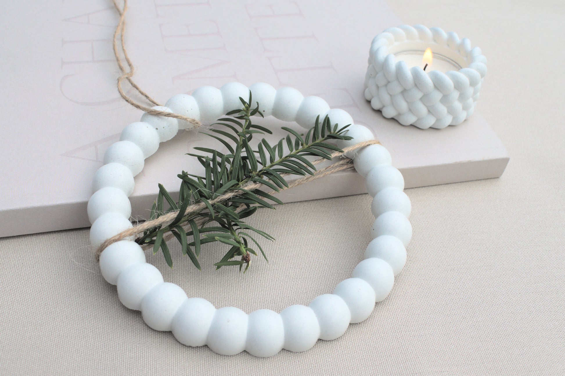 Dieser zarte Kranz aus weißem Beton erinnert mit seiner Form an kleine, aneinandergereihte Schneebälle – perfekt für alle, die minimalistische Winterdeko mit besonderem Charme lieben.