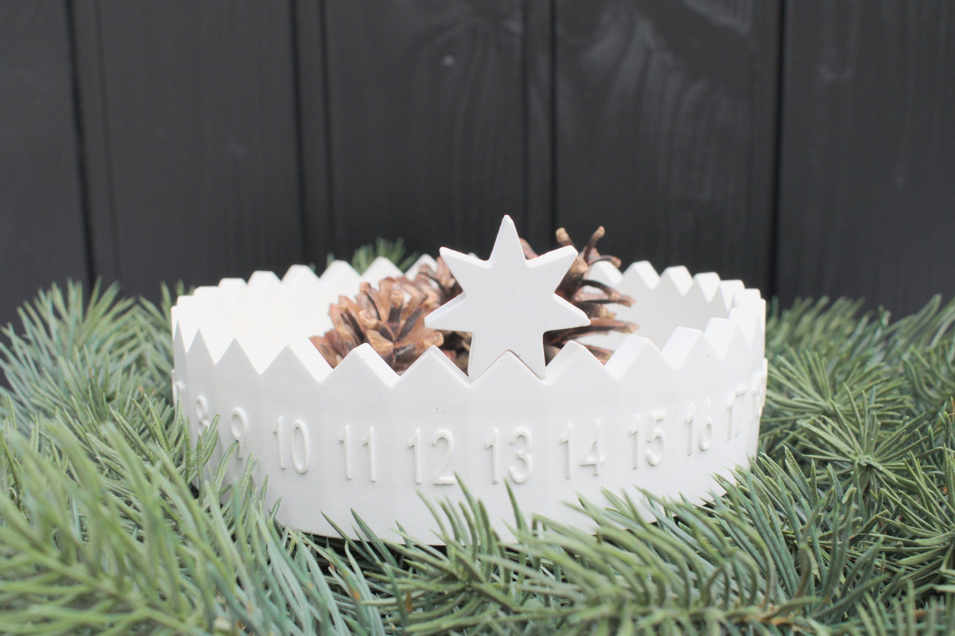 Skandinavischer Adventskalender aus weißem Beton für ein hygge Weihnachten